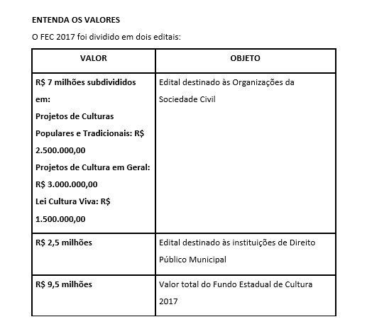Com 85% dos recursos destinados ao interior, o edital 2017 do Fundo Estadual de Cultura (FEC) contemplou 197 projetos e disponibilizou R$ 9,5 milhões para projetos culturais que tradicionalmente encontram dificuldades em captar no mercado.