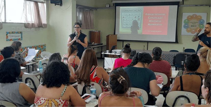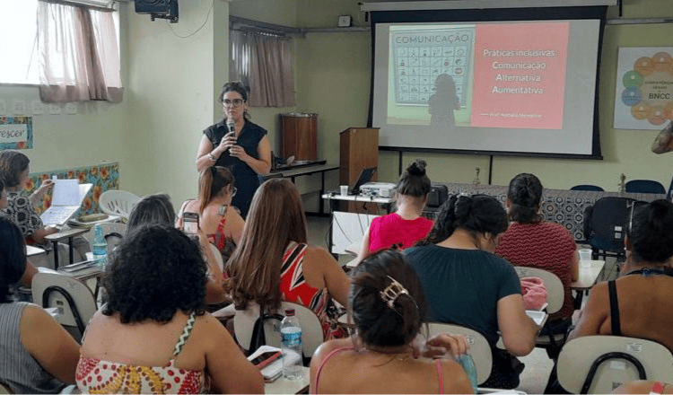 Com o tema “AEE pra valer: tecendo escola para todos!”, as atividades foram desenvolvidas nos períodos da manhã e da tarde, de modo que todos os professores do AEE que atuam nas escolas da rede municipal e nos Centros de Atendimento Educacional Especializado (CAEE) pudessem comparecer à formação. Ao longo da programação, foram trabalhados aspectos relacionados aos modelos de compreensão da deficiência e sua relação com o Serviço de AEE, ao atendimento nas Salas de Recursos Multifuncionais, à relação dos professores de AEE com o Serviço de Profissional de Apoio (PDA), à Tecnologia Assistiva na educação e ao Plano de AEE.