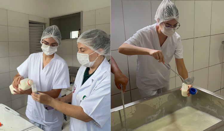 As visitas incluem ainda a realização de swabs (testes de superfície) em equipamentos, formas, mesas e nas mãos dos manipuladores, além do monitoramento da qualidade do ar nos ambientes de fabricação e câmaras frias, para identificação de fungos e leveduras. A proposta é mapear possíveis fontes de contaminação e compreender como fatores como manejo dos animais, ordenha e rotinas de higienização influenciam o produto final.