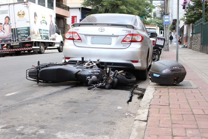 Um Ford/Fiesta e uma motocicleta se envolveram em um acidente na tarde dessa quarta-feira, 5, no cruzamento entre as ruas Santo Antônio e Barão de Cataguases, região Central.